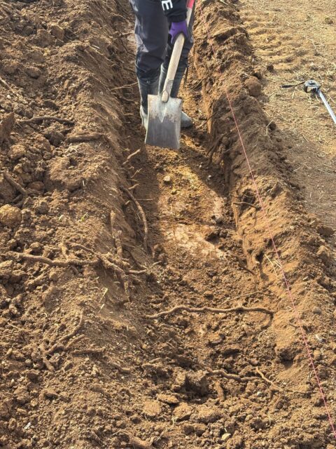 重機と人力を併用し、所定の深さ・幅で溝を掘削します。水糸に沿って真っ直ぐに掘り進め、底面も均一な勾配になるよう調整。根や石などの障害物も丁寧に除去します。