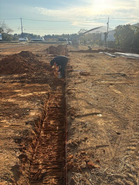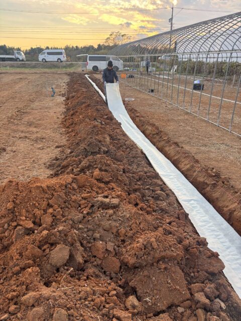 今回の工事では、ビニールハウス建設に先立ち、農地の排水環境を整備しました。各工程を写真とともにご紹介します。